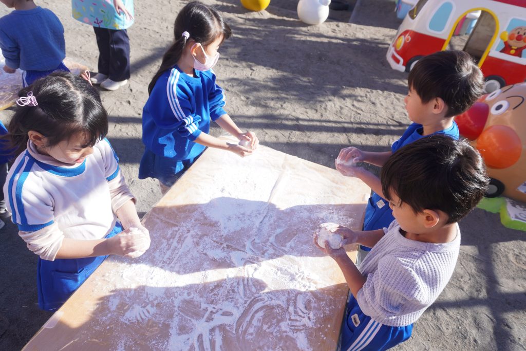年末に5才児クラス ひかり組のみんなで、鏡もち作りをしました。つきたてのおもちは、丸くするのが難しかったけれど、温かくてやわらかくて、みんなニコニコでした。保育園の玄関にも鏡もちをお供えして、新年を迎えました。今年もどうぞよろしくお願い致します。