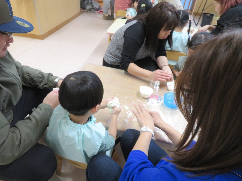 2歳児クラスはお父さん、お母さんと一緒に小麦粘土作り、4歳児クラスは万華鏡を作りました。