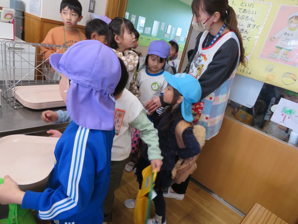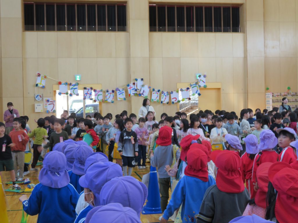 小学生と保育園児の2人から3人のペアーを作り、1年生の教室や体育館に設定してあるコーナーを回るといったものです。算数、国語、体育、音楽、給食、昔遊びなどのコーナーを回り、終わったらシールを張り、全部のコーナーを回る。ペアーになった小学生のリードで、手を繋ぎながら行先を相談し合う姿が見られました。給食のコーナーでは、給食の時間の模擬体験もしました。みんな興味津々で、それぞれのコーナーで名前を書いて、数字を書いたり、製作を作ったり、ジャンボリミッキーを踊ったりと色々な経験をしました。