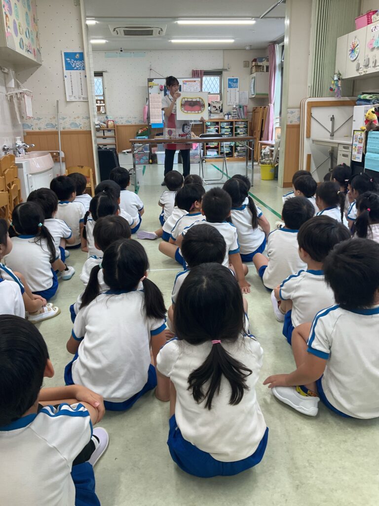 8月7日㈭ 子ども達の歯科検診を担当している歯医者さんに「歯の大切さについて」お話をしてもらいました。ミニオンが甘い物を食べて歯磨きもしないで寝てしまった。と言う内容で子ども達の知っているキャラクターでお話してくれたので、良くお話を聞いていました。