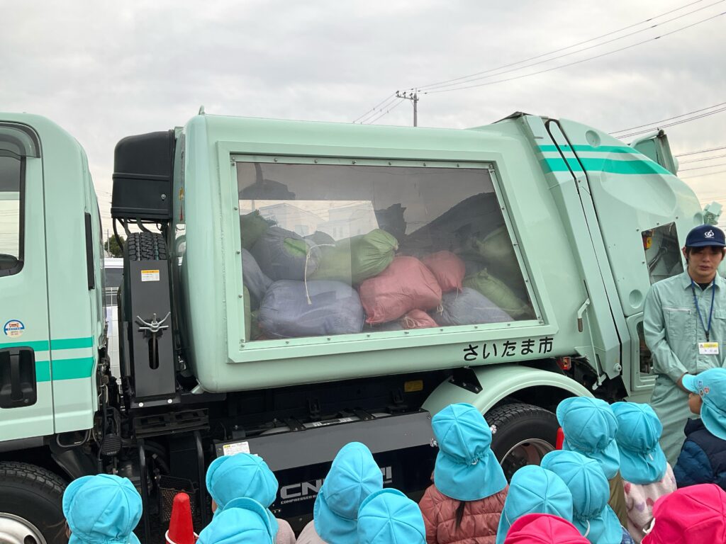 今日は3,4,5歳がゴミスクールに参加しました。ごみの分別ゲームをしたり、紙芝居を読んでもらいました。横が透明のごみ収集車にゴミを入れると、中の様子が良く見えて、子ども達は食い入るように見ていました。クリスマス発表会も終わり、今日は楽しい一日になりました。