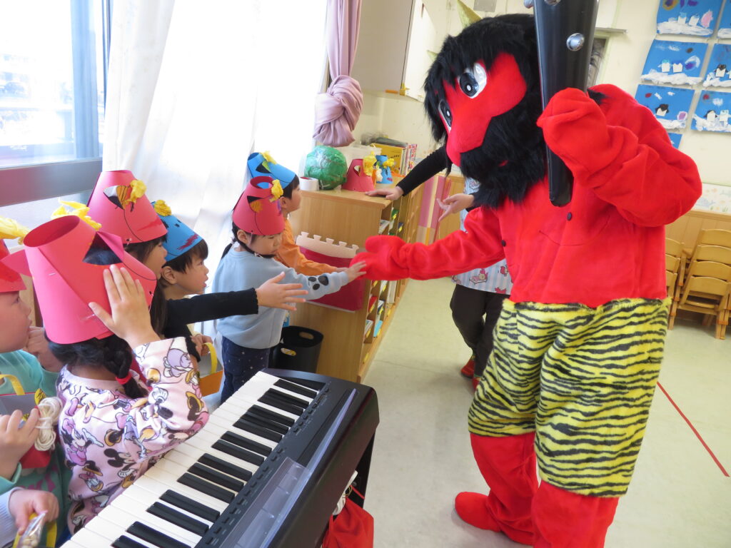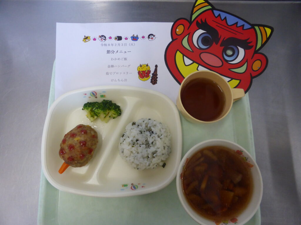 今日は節分!給食は節分メニューで、鬼の金棒ハンバーグ、おやつは鬼ケーキでした。皆モリモリと沢山食べました。午後は豆まきをして、鬼退治をしました。鬼が怖くて泣いてしまった子もいましたが、その後は仲良くなって、仲直り.みんなで写真を撮りました。